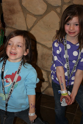 After that we got dressed and packed up all our stuff. John loaded up the car (thanks Dad!) and then we made our last trip to the casino, I mean arcade. The kids spent the last of their tokens. The girls got their sparkle tattoos (included with the Paw Pass) and Gwen and John became wizards or lord magi or something. Jack refused the sparkle tattoo, cause he's too manly for that. Instead he wore his party hat and hit us with his balloon sword.